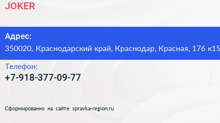 JOKER по адресу 350020, Краснодарский край, Краснодар, Красная, 176 к15 в дальнейшем Организация, размещена в следующих категориях: