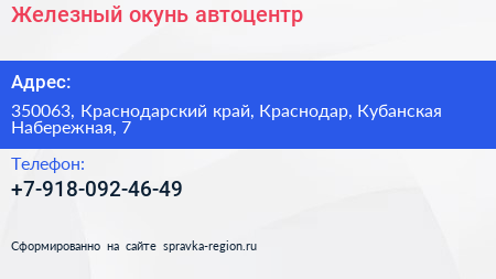 Железный окунь, автоцентр по адресу 350063, Краснодарский край, Краснодар, Кубанская Набережная, 7 в дальнейшем Организация, размещена в следующих категориях: