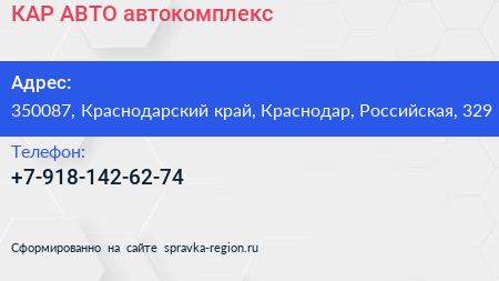 КАР-АВТО, автокомплекс по адресу 350087, Краснодарский край, Краснодар, Российская, 329 в дальнейшем Организация, размещена в следующих категориях: