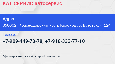 КАТ СЕРВИС, автосервис по адресу 350002, Краснодарский край, Краснодар, Базовская, 124 в дальнейшем Организация, размещена в следующих категориях: