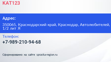 KAT123 по адресу 350065, Краснодарский край, Краснодар, Автолюбителей, 1/2 лит Я в дальнейшем Организация, размещена в следующих категориях: