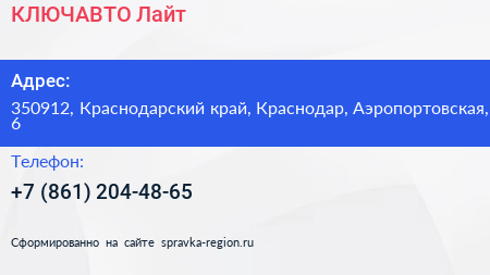 КЛЮЧАВТО Лайт по адресу 350912, Краснодарский край, Краснодар, Аэропортовская, 6 в дальнейшем Организация, размещена в следующих категориях: