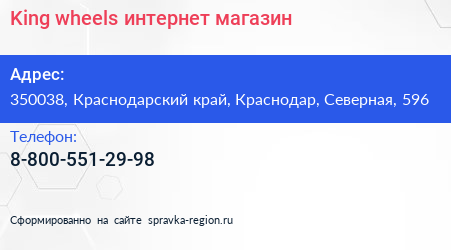 King-wheels, интернет-магазин по адресу 350038, Краснодарский край, Краснодар, Северная, 596 в дальнейшем Организация, размещена в следующих категориях: