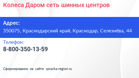 Колеса Даром, сеть шинных центров по адресу 350075, Краснодарский край, Краснодар, Селезнёва, 44 в дальнейшем Организация, размещена в следующих категориях: