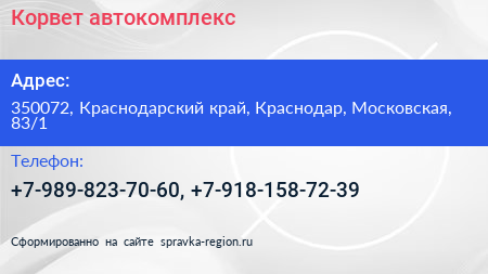 Корвет, автокомплекс по адресу 350072, Краснодарский край, Краснодар, Московская, 83/1 в дальнейшем Организация, размещена в следующих категориях: