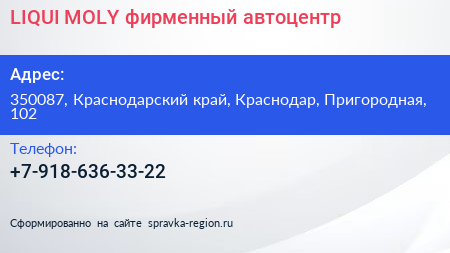 LIQUI MOLY, фирменный автоцентр по адресу 350087, Краснодарский край, Краснодар, Пригородная, 102 в дальнейшем Организация, размещена в следующих категориях: