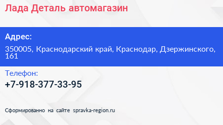 Лада-Деталь, автомагазин по адресу 350005, Краснодарский край, Краснодар, Дзержинского, 161 в дальнейшем Организация, размещена в следующих категориях: