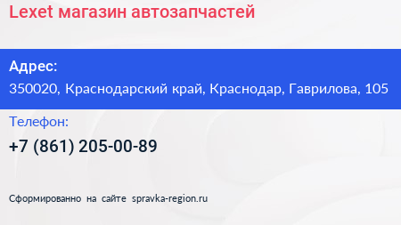 Lexet, магазин автозапчастей по адресу 350020, Краснодарский край, Краснодар, Гаврилова, 105 в дальнейшем Организация, размещена в следующих категориях: