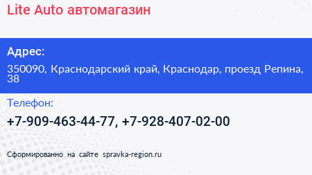 Lite Auto, автомагазин по адресу 350090, Краснодарский край, Краснодар, проезд Репина, 38 в дальнейшем Организация, размещена в следующих категориях: