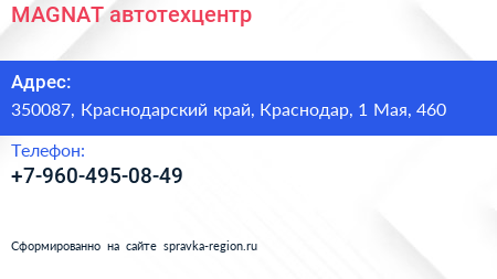 MAGNAT, автотехцентр по адресу 350087, Краснодарский край, Краснодар, 1 Мая, 460 в дальнейшем Организация, размещена в следующих категориях: