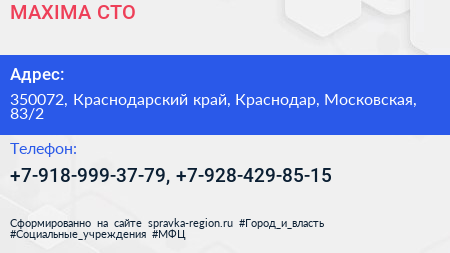 MAXIMA, СТО по адресу 350072, Краснодарский край, Краснодар, Московская, 83/2 в дальнейшем Организация, размещена в следующих категориях:
