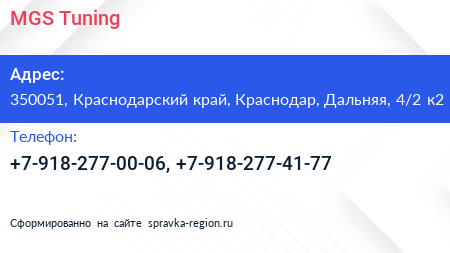 MGS-Tuning по адресу 350051, Краснодарский край, Краснодар, Дальняя, 4/2 к2 в дальнейшем Организация, размещена в следующих категориях: