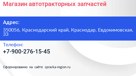 Магазин автотракторных запчастей по адресу 350056, Краснодарский край, Краснодар, Евдокимовская, 33 в дальнейшем Организация, размещена в следующих категориях: