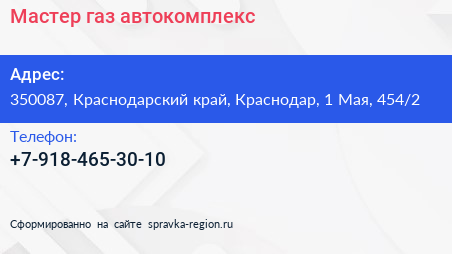 Мастер газ, автокомплекс по адресу 350087, Краснодарский край, Краснодар, 1 Мая, 454/2 в дальнейшем Организация, размещена в следующих категориях: