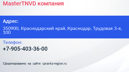 MasterTNVD, компания по адресу 350900, Краснодарский край, Краснодар, Трудовая 3-я, 100 в дальнейшем Организация, размещена в следующих категориях: