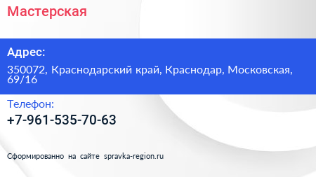 Мастерская по адресу 350072, Краснодарский край, Краснодар, Московская, 69/16 в дальнейшем Организация, размещена в следующих категориях: