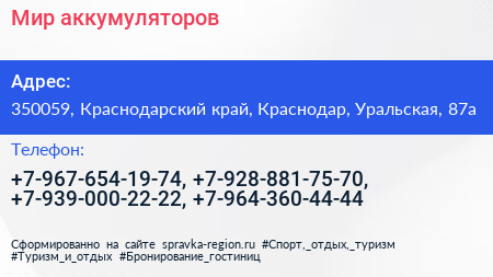 Мир аккумуляторов по адресу 350059, Краснодарский край, Краснодар, Уральская, 87а в дальнейшем Организация, размещена в следующих категориях: