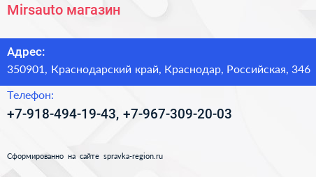Mirsauto, магазин по адресу 350901, Краснодарский край, Краснодар, Российская, 346 в дальнейшем Организация, размещена в следующих категориях: