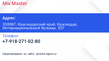 Mix Master по адресу 350087, Краснодарский край, Краснодар, Интернациональный бульвар, 107 в дальнейшем Организация, размещена в следующих категориях:
