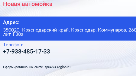 Новая, автомойка по адресу 350020, Краснодарский край, Краснодар, Коммунаров, 268 лит Г38а в дальнейшем Организация, размещена в следующих категориях: