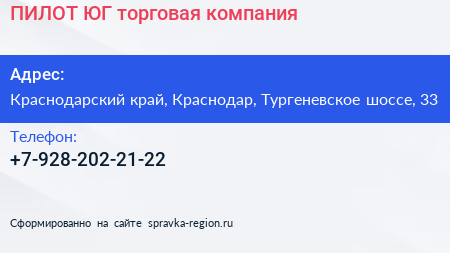 ПИЛОТ-ЮГ, торговая компания по адресу Краснодарский край, Краснодар, Тургеневское шоссе, 33 в дальнейшем Организация, размещена в следующих категориях: