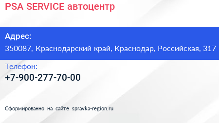 PSA SERVICE, автоцентр по адресу 350087, Краснодарский край, Краснодар, Российская, 317 в дальнейшем Организация, размещена в следующих категориях: