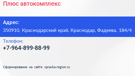 Плюс, автокомплекс по адресу 350910, Краснодарский край, Краснодар, Фадеева, 184/4 в дальнейшем Организация, размещена в следующих категориях:
