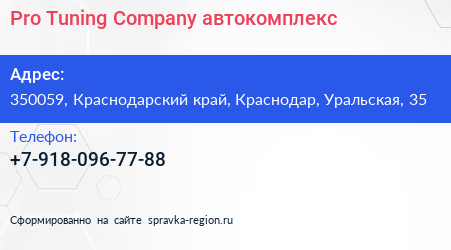 Pro-Tuning Company, автокомплекс по адресу 350059, Краснодарский край, Краснодар, Уральская, 35 в дальнейшем Организация, размещена в следующих категориях: