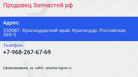 Продавец-Запчастей.рф по адресу 350087, Краснодарский край, Краснодар, Российская, 369/1 в дальнейшем Организация, размещена в следующих категориях: