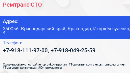 Ремтранс, СТО по адресу 350056, Краснодарский край, Краснодар, Игоря Безуленко, 4 в дальнейшем Организация, размещена в следующих категориях: