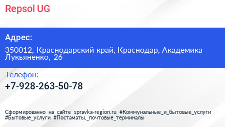 Repsol-UG по адресу 350012, Краснодарский край, Краснодар, Академика Лукьяненко, 26 в дальнейшем Организация, размещена в следующих категориях: