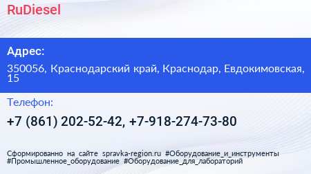 RuDiesel по адресу 350056, Краснодарский край, Краснодар, Евдокимовская, 15 в дальнейшем Организация, размещена в следующих категориях: