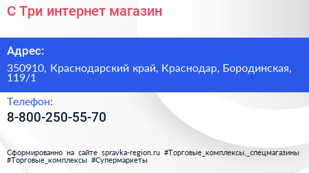 С-Три, интернет-магазин по адресу 350910, Краснодарский край, Краснодар, Бородинская, 119/1 в дальнейшем Организация, размещена в следующих категориях: