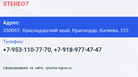 STEREO7 по адресу 350047, Краснодарский край, Краснодар, Каляева, 155 в дальнейшем Организация, размещена в следующих категориях: