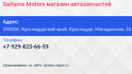 Saitama-Motors, магазин автозапчастей по адресу 350056, Краснодарский край, Краснодар, Магаданская, 32 в дальнейшем Организация, размещена в следующих категориях:
