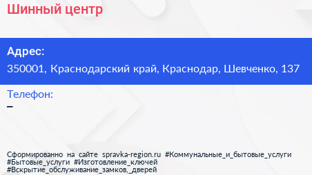 Шинный центр по адресу 350001, Краснодарский край, Краснодар, Шевченко, 137 в дальнейшем Организация, размещена в следующих категориях: