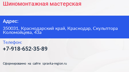 Шиномонтажная мастерская по адресу 350031, Краснодарский край, Краснодар, Скульптора Коломойцева, 43а в дальнейшем Организация, размещена в следующих категориях: