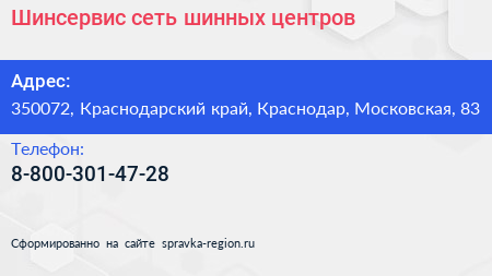 Шинсервис, сеть шинных центров по адресу 350072, Краснодарский край, Краснодар, Московская, 83 в дальнейшем Организация, размещена в следующих категориях: