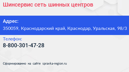 Шинсервис, сеть шинных центров по адресу 350059, Краснодарский край, Краснодар, Уральская, 98/3 в дальнейшем Организация, размещена в следующих категориях: