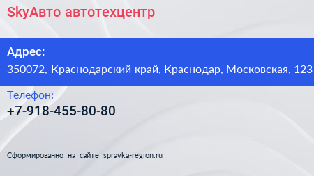 SkyАвто, автотехцентр по адресу 350072, Краснодарский край, Краснодар, Московская, 123 в дальнейшем Организация, размещена в следующих категориях: