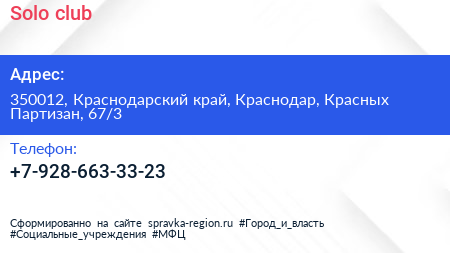 Solo сlub по адресу 350012, Краснодарский край, Краснодар, Красных Партизан, 67/3 в дальнейшем Организация, размещена в следующих категориях: