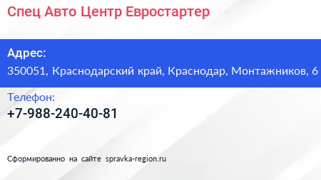 Спец Авто Центр Евростартер по адресу 350051, Краснодарский край, Краснодар, Монтажников, 6 в дальнейшем Организация, размещена в следующих категориях: