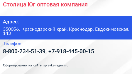 Столица-Юг, оптовая компания по адресу 350056, Краснодарский край, Краснодар, Евдокимовская, 143 в дальнейшем Организация, размещена в следующих категориях: