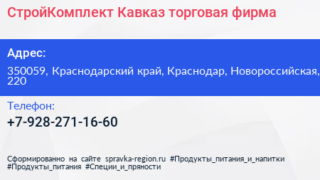 СтройКомплект-Кавказ, торговая фирма по адресу 350059, Краснодарский край, Краснодар, Новороссийская, 220 в дальнейшем Организация, размещена в следующих категориях: