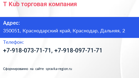T-Kub, торговая компания по адресу 350051, Краснодарский край, Краснодар, Дальняя, 2 в дальнейшем Организация, размещена в следующих категориях: