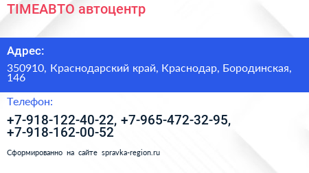 TIMEАВТО, автоцентр по адресу 350910, Краснодарский край, Краснодар, Бородинская, 146 в дальнейшем Организация, размещена в следующих категориях: