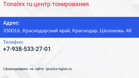 Tonalex.ru, центр тонирования по адресу 350016, Краснодарский край, Краснодар, Шолохова, 48 в дальнейшем Организация, размещена в следующих категориях: