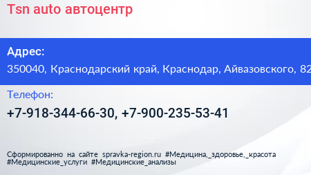 Tsn-auto, автоцентр по адресу 350040, Краснодарский край, Краснодар, Айвазовского, 82 в дальнейшем Организация, размещена в следующих категориях: