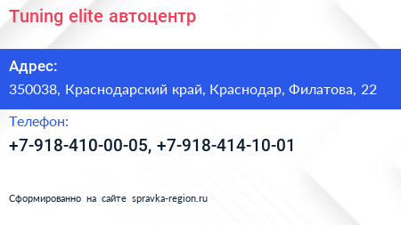 Tuning-elite, автоцентр по адресу 350038, Краснодарский край, Краснодар, Филатова, 22 в дальнейшем Организация, размещена в следующих категориях: