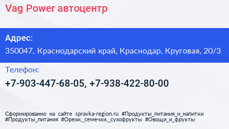 Vag-Power, автоцентр по адресу 350047, Краснодарский край, Краснодар, Круговая, 20/3 в дальнейшем Организация, размещена в следующих категориях: